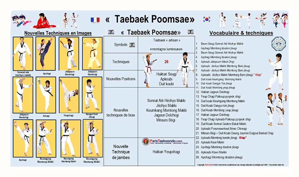 Les 8 premiers Poomsae de Taekwondo forment un ensemble dans la progression des connaissances, selon la méthode établie par le Centre Mondial du Taekwondo. Les 8 Taegeuk Poomsae sont destinés à l’apprentissage et au perfectionnement des 10 niveaux (keup) de pratique et sont réservés aux ceintures de couleur (Youkeupja) et à la ceinture noire 1er Dan (Youdanja).