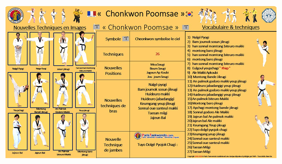 La connaissance progressive de ces formes est exigée lors des tests de promotion, de la ceinture blanche à la ceinture noire 9ème Dan de Taekwondo Kukkiwon.
