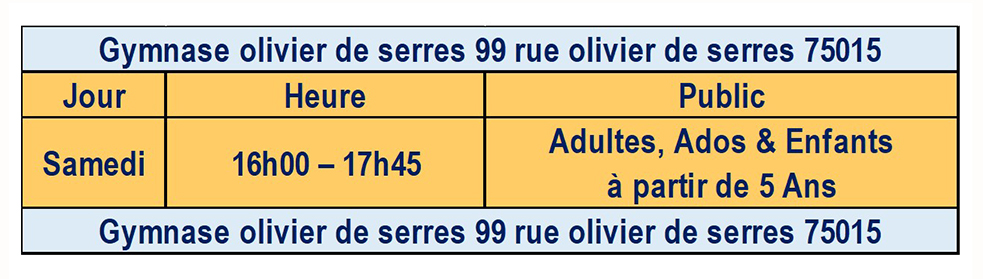 Adresse : Gymnase olivier de serres 99 rue olivier de serres 75015 Métro : Porte de Versailles