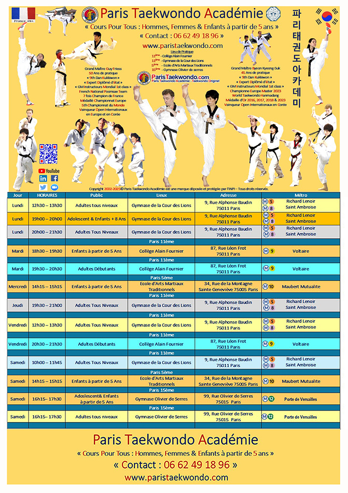 Paris Taekwondo Academie planning officiel des cours enfants, adolescents et Adultes